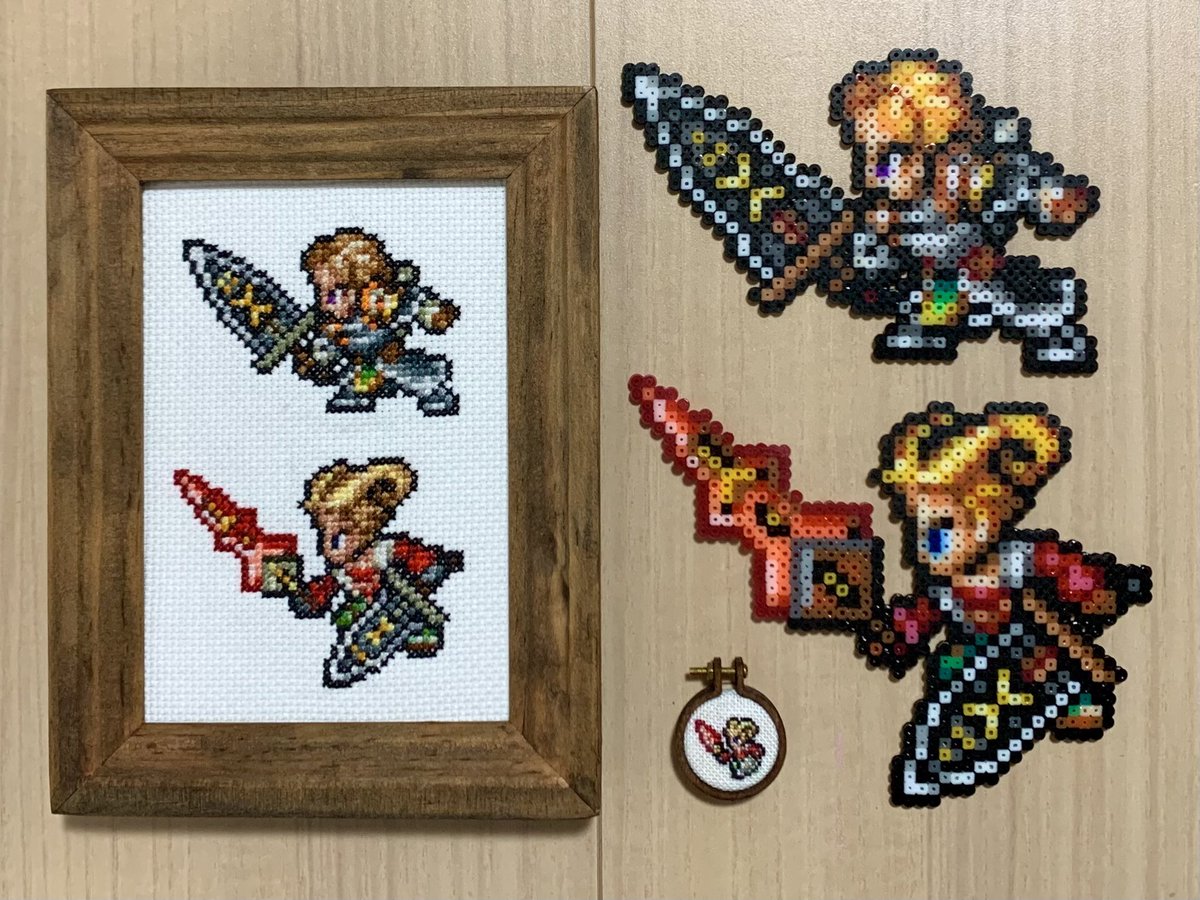 クロスステッチとアイロンビーズの大きさ比較 クロスステッチのギュスターヴとグスタフは 糸の種類が少ない頃の作品ですが今でもお気に入り 並べるとこの前のグスタフは小さくてよく見えないですね #クロスステッチ #アイロンビーズ #ロマサガRS #新ロマサガRS #ドット絵 #pixelart