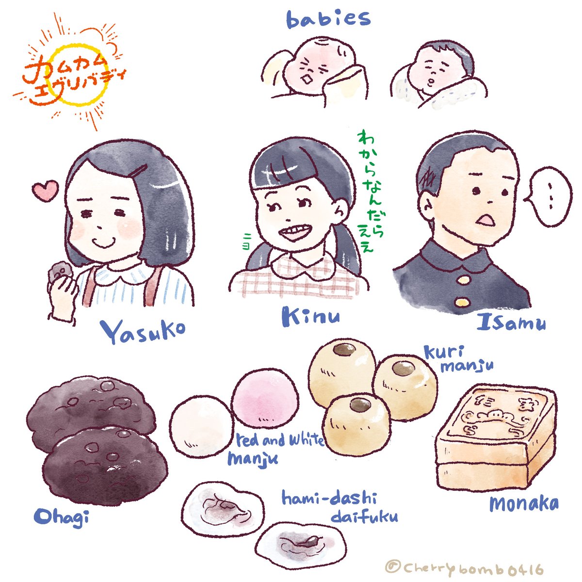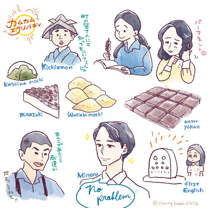 今日も和菓子がおいしそうだった!吉右衛門くんの達観した感じ、「梵天丸も、かくありたい」感がある…。稔さんの涼し気な目元とさわやかオーラ凄まじいな!そして勇ちゃんは未だに安子の名前いじりしてんのか! #カムカムエヴリバディ #カムカム絵