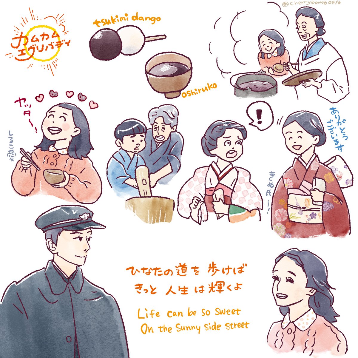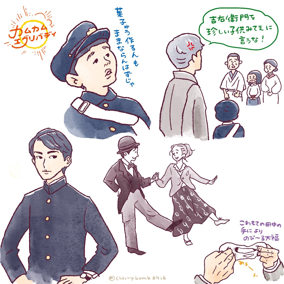 吉右衛門くんは尋常小学校の1年生になったんかな?数年後、どんな気持ちで教科書に墨を塗るのかとか考えたると辛いわ…(妄想が走りすぎる)。算太のダンス素敵!稔さんはお座敷の隅っこに座ってるだけでかっこいいのかよ… #カムカムエヴリバディ #カムカム絵