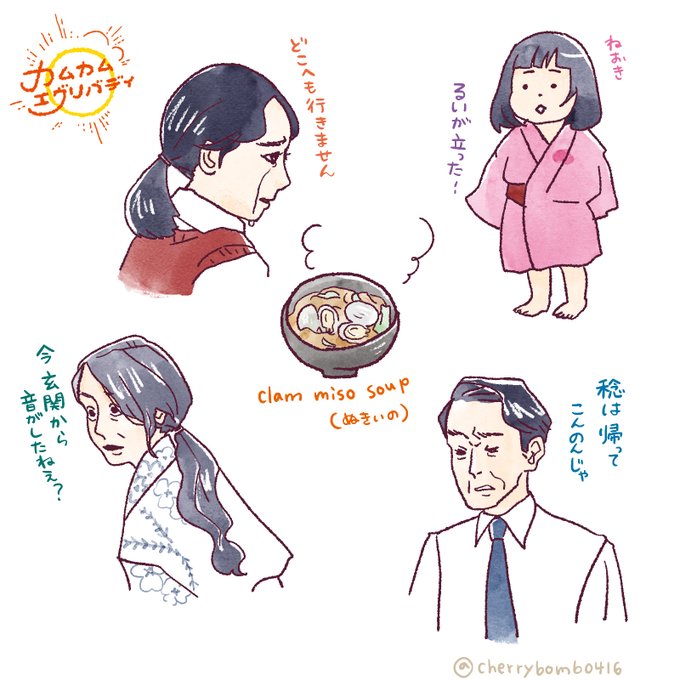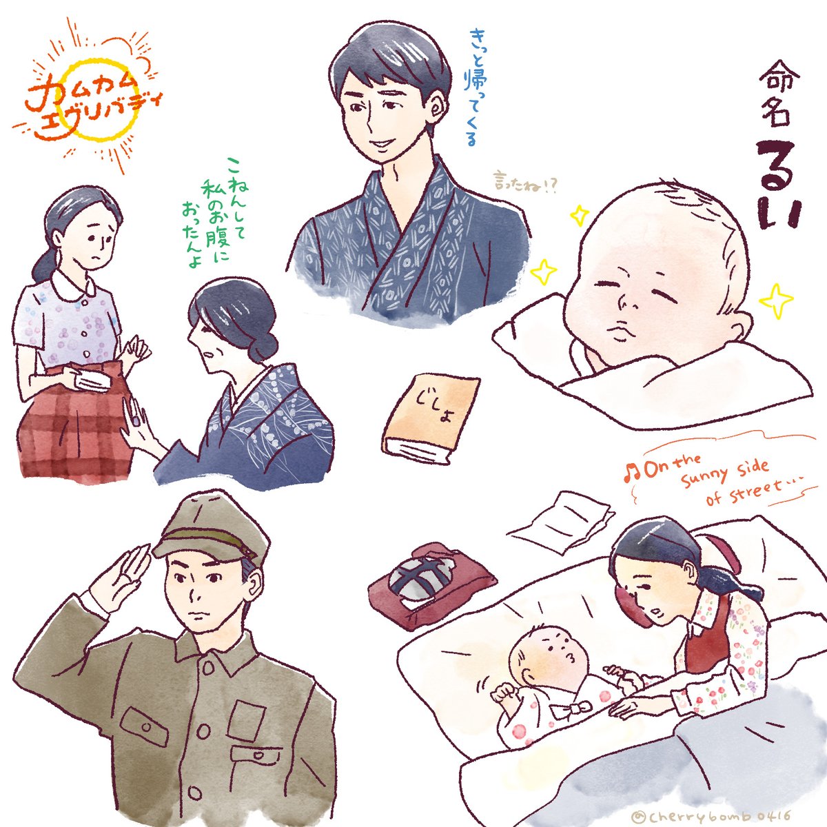 稔さん、きっと帰ってくるって言ったんだから帰ってきてね(そして前髪おろし稔さんもいいですね)。るいちゃん爆誕!かわいい!勇ちゃんも無事で帰ってきて…。名前の由来と子守唄の秘密、枕元の防災頭巾と水筒、つらいのう😭 #カムカムエヴリバディ #カムカム絵