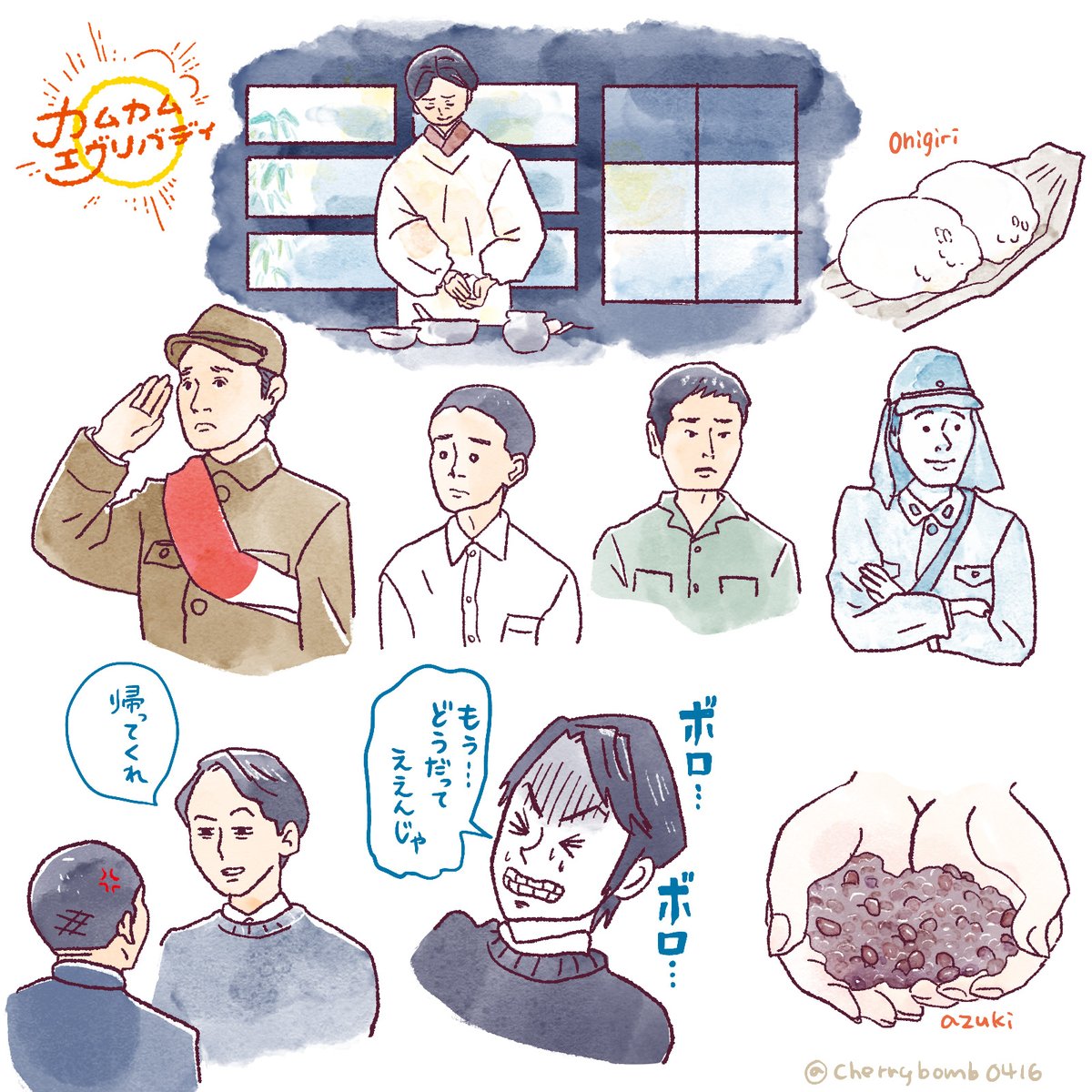 泣きながら真っ白なお米でおにぎりを作る小しずさん…。みんな無事で帰ってきて。安子ちゃんの話を切り出された途端に目から光が消える稔さん😭つやつやした小豆がめっちゃきれい… #カムカムエヴリバディ #カムカム絵