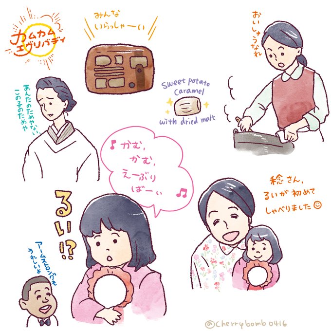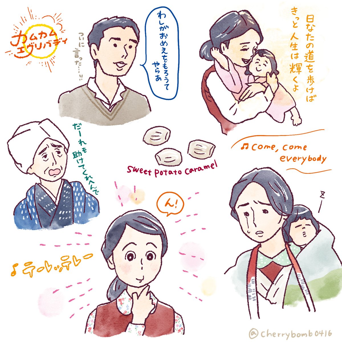 いやもうほんと勇ちゃんに幸あれ…!芋飴を食べた安子ちゃんの目に、いっときだけど光が宿って嬉しかった🍬証城寺の狸囃子のメロディーは、温かい記憶を呼び起こさせるけど、その時一緒にいた家族や職人さんたちが今は周りにいないのは寂しい…😢 #カムカムエヴリバディ #カムカム絵