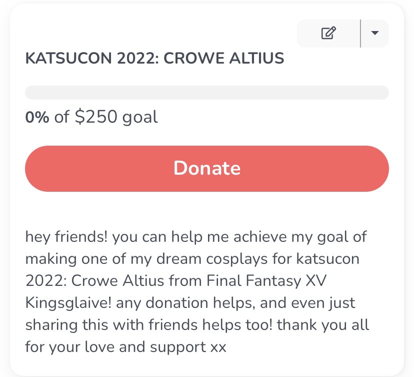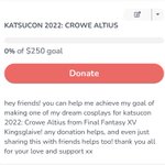 hey friends!✨ I have a new goal set up on my Ko-Fi page! Crowe Altius has been one of my dream cosplays for a while now and I want to work hard to make her happen for #katsucon 2022!! I don’t expect to reach my goal, but the extra support helps!! 💕 ko-fi.com/cherrycos