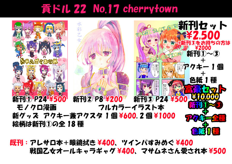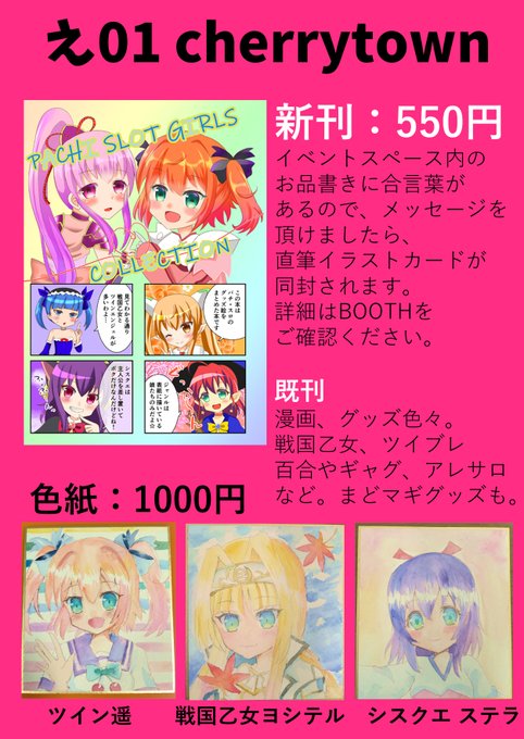 9/24~25のオンラインイベント『推し込め!レバーオン!』のお品書きです。 9/24の12時にBOOTHを開けます。 エアスケブはできませんが、推しレバ特典として新刊ご購入いただいた方への特典で鉛筆画のイラストを同封予定です。 よろしくお願い致します。 cherrytown.booth.pm