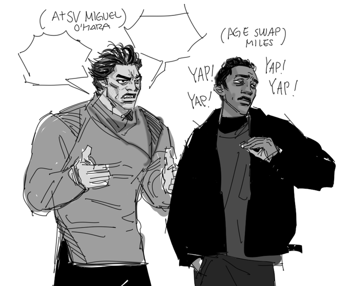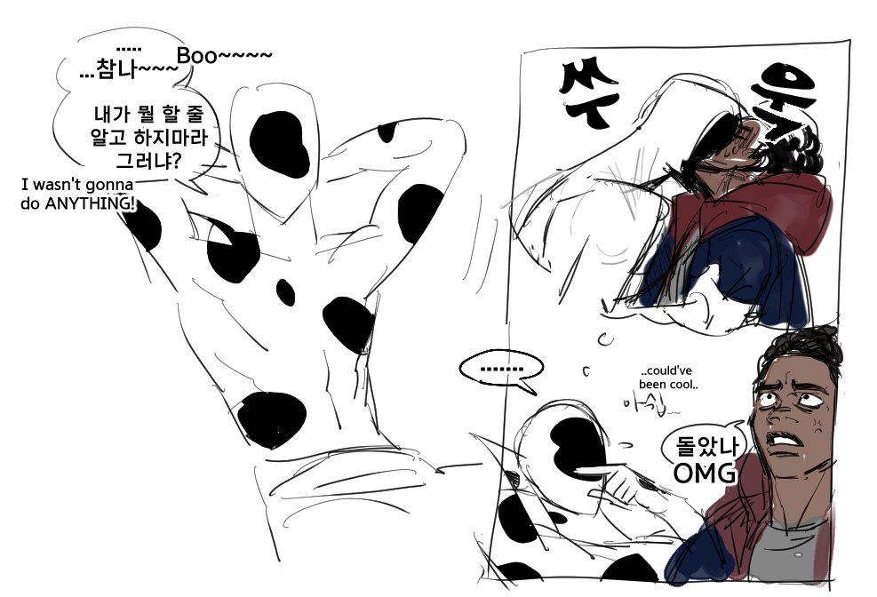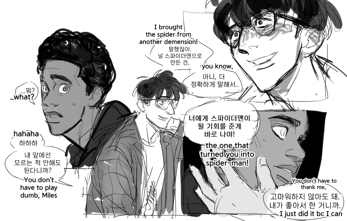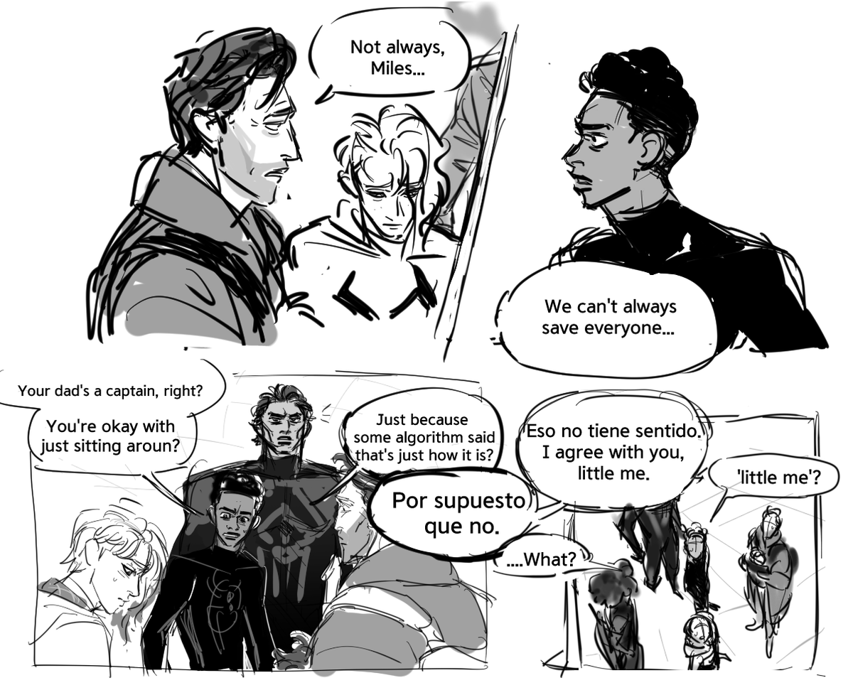 45 112 It's just 30s Miles teasing older spiders and impressing teenagers. Honestly, all of that are just for the 'hola chicos' part lol (I googled around for Spanish phrases so they might be awkward ㅠㅠ) 23/08/02 15:49