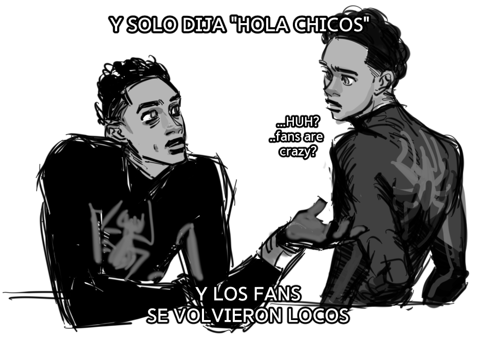 It's just 30s Miles teasing older spiders and impressing teenagers. Honestly, all of that are just for the 'hola chicos' part lol (I googled around for Spanish phrases so they might be awkward ㅠㅠ)