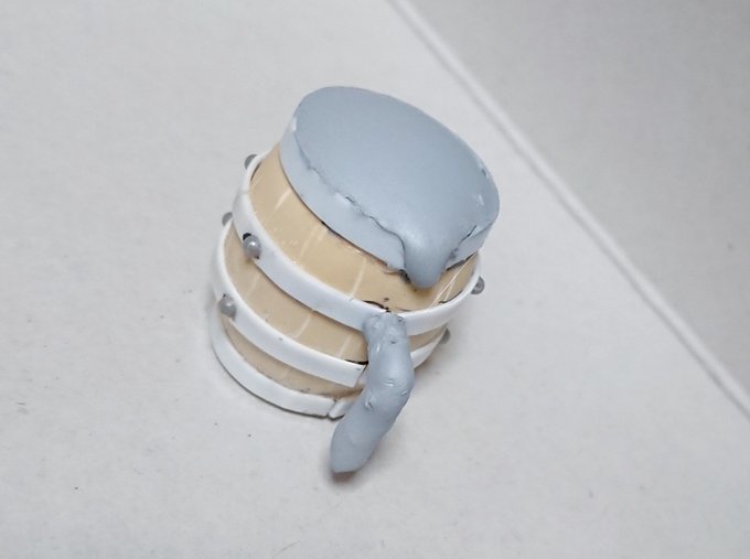 #これを見た人は塗装前と塗装後を貼れ 余ったエポパテをマシュマロ型にまとめておいて削って整えて木目なんとなく彫って、 プラ板をGクリヤーボンドで貼り付けてwaveのリベットぽちぽち貼って、 コトブキヤのフックⅡは細かったからラッカーパテで肉付け 上の接着剤や繋ぎ目見え見えの部分も(↓続