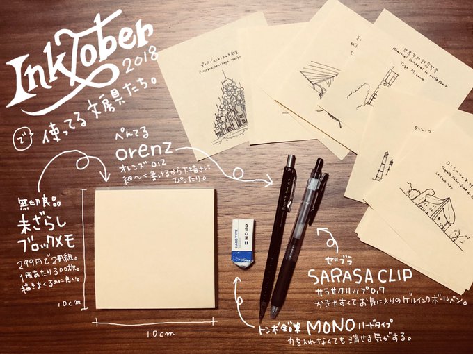 #inktober で使ってる文房具たちー。 下描きはぺんてるのオレンズ0.2。ペン入れはゼブラのサラサクリップ0.7。 描いた建築物まとめてるよ → twitter.com/i/moments/1008…