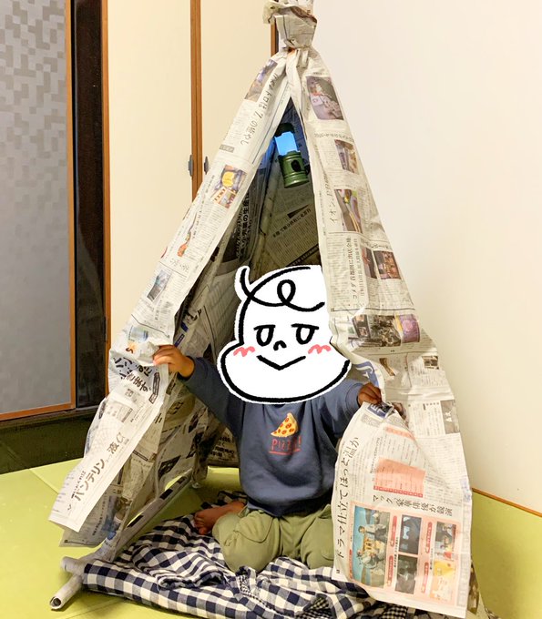 できたぞーーーー!!!日経MJテントッ!!!昼からNERF(ライフル)が届くので回復スポットにする予定。さぁ戦の始まりだッ!!!!…オットを蜂の巣にする😏 画像3枚を並べた時の新しい画像比率は【7:8+16:9×2枚】 #チビッコのムスコスキー #育児絵日記 #新聞紙テント