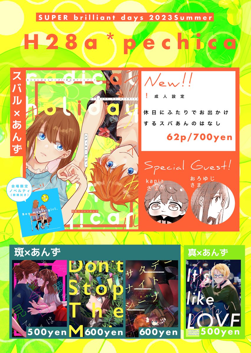 8/20 SUPER brilliantdays2023夏 【3号館 H28a「pechica」】 当日お品書き兼ポスターです🌻☀️🍉🪼🌟 ▷pixiv.net/artworks/11083… スバあん新刊、斑あん・まこあん既刊の5種📚 会場限定で新刊購入の方にノベルティ配布、無配にトリスタ赤組+あんず漫画を準備中です✍️