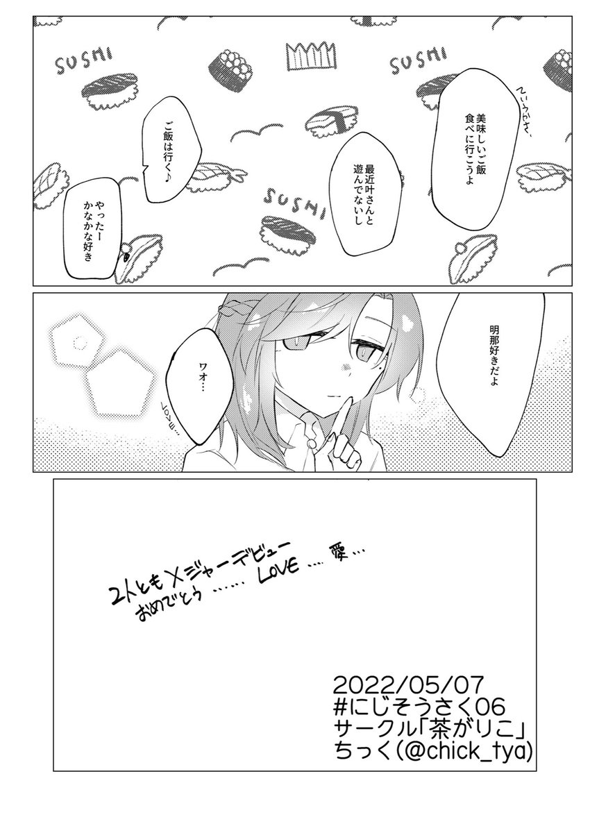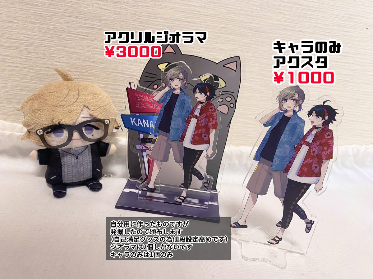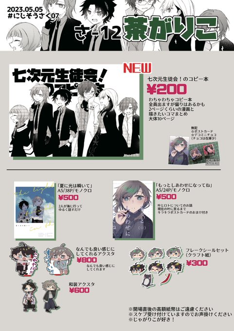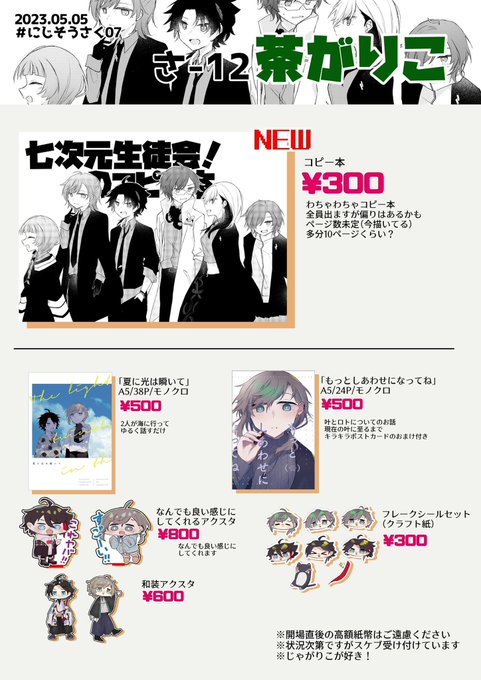 お品書き更新しました! コピ本の値段を¥300→¥200にしたり無配について載せたりしました。これ以上の変更は無いです。 あとアクスタについて表記が分かりにくかったので… アクリルジオラマ 在庫2個 キャラのみアクスタ 在庫1個 です!早い者勝ちです! #にじそうさく07 twitter.com/chick_tya/stat…