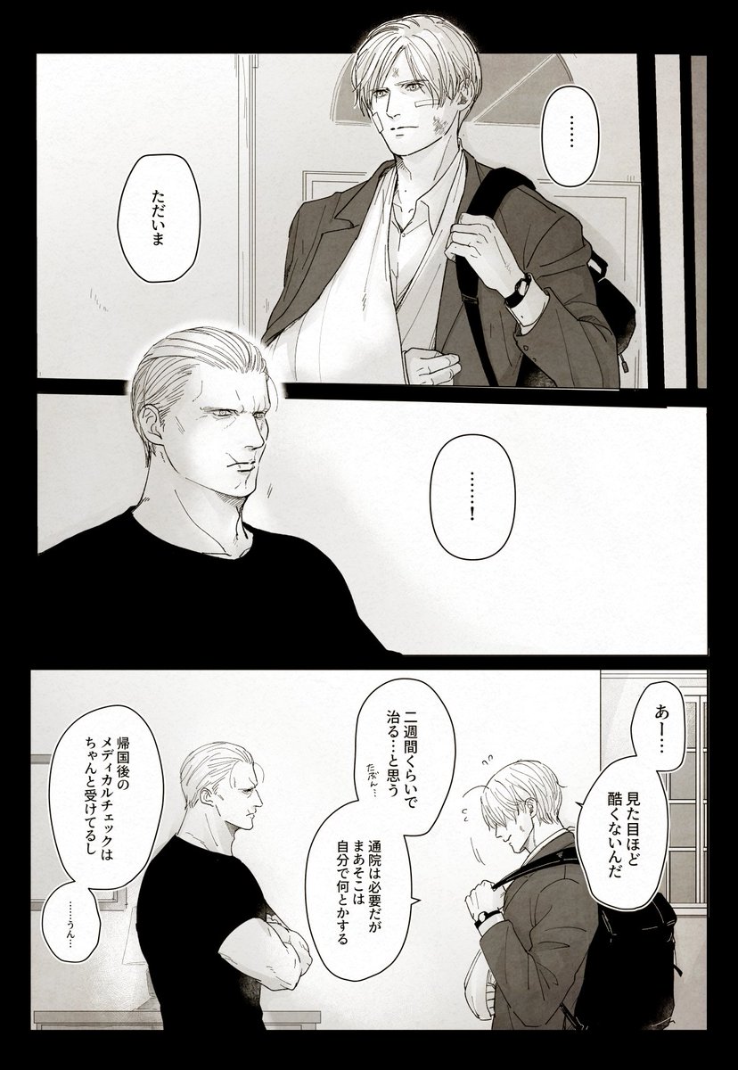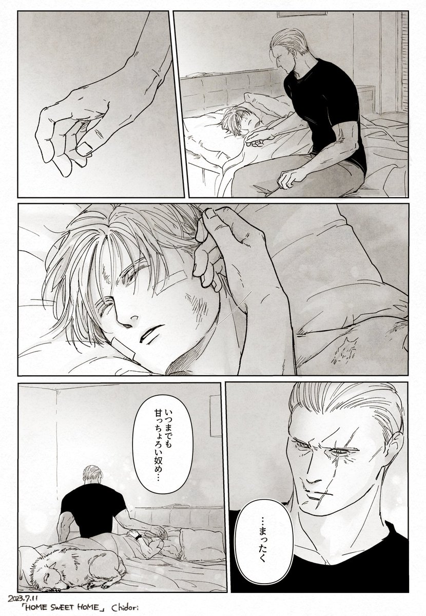 100 537 スコット君は家とか家族とかに特別な思い入れがあったらいいなという同居クラレオ。 「怪我を介抱する少佐」という素敵なお題から描き始めたんですけど全然介抱してなくてごめんなさい🥺 23/07/12 00:34