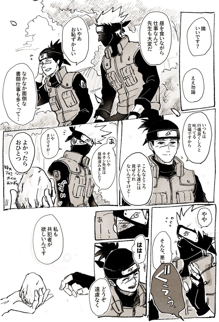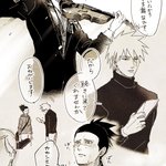 ついにコマまで割って描いてしまった中忍と上忍師カカイル。いつのまにか素顔公開されてたカカシ先生、口元にホクロあるのは卑怯〜