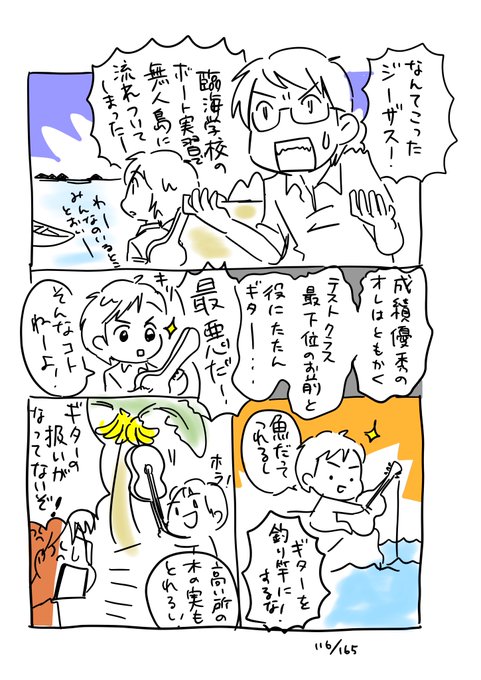 #コルクラボマンガ専科 #今日の1ページ 116/165 頭脳明晰な主人公と、成績底辺のギター小僧が無人島に流れ着いたらどうなるか。 みたいな。 #毎日読もう・あげよう1Pマンガ #バディマンガ案試行中