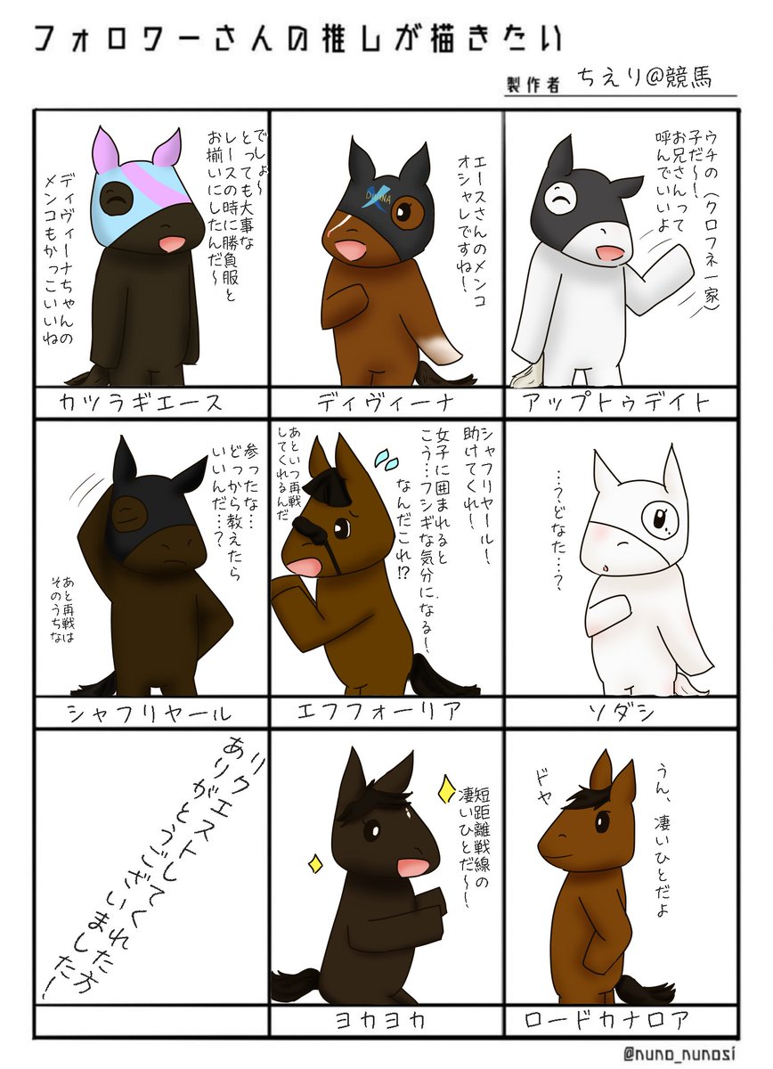 これで募集していたやつ描けました! リクエストしてくれた🐴たちの会話考えるの楽しかったです リクエストしてくれた皆さんありがとうございます! #フォロワーさんの推しが描きたい twitter.com/chieriKeiba/…