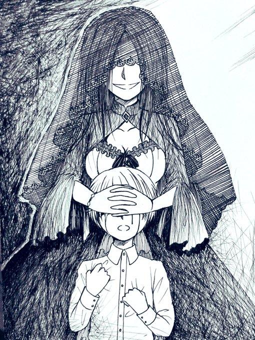 #春の創作クラスタフォロー祭り #ダークな雰囲気が好きな創作クラスタさんと繋がりたい #魔女は嗤う #落書きギルド 今日はヴァルプルギスの夜と言うことで、「魔女は嗤う」より欲視の魔女・ミカエラと主人公クロウ(幼少期)を描いたよ。 タグ連投失礼( ̄Д ̄)ノ