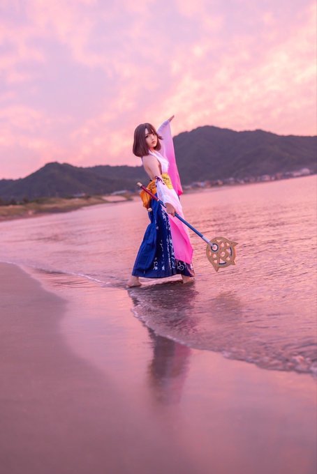 コスプレ⚠️FF10 ユウナ 異界送りまとめ 全部同じ日の写真なんだけど夕日の色がすぐ変わっていろんな景色が見れた😆オレンジからピンクになって落ちていく…綺麗だった✨ 📸@Tottorikyozinn
