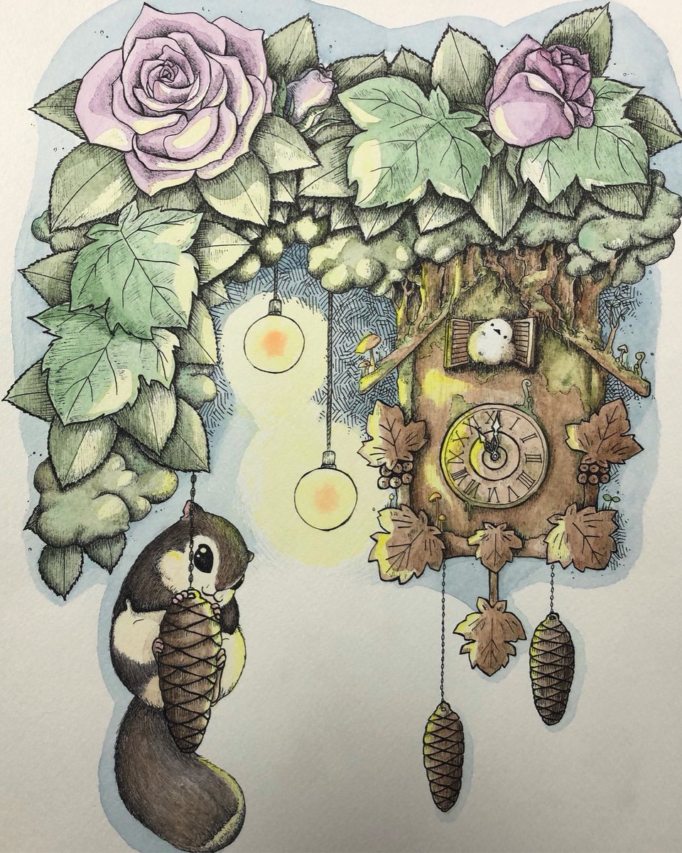 夜の鳩時計の森 #イラスト #ペン画 #エゾモモンガ #シマエナガ
