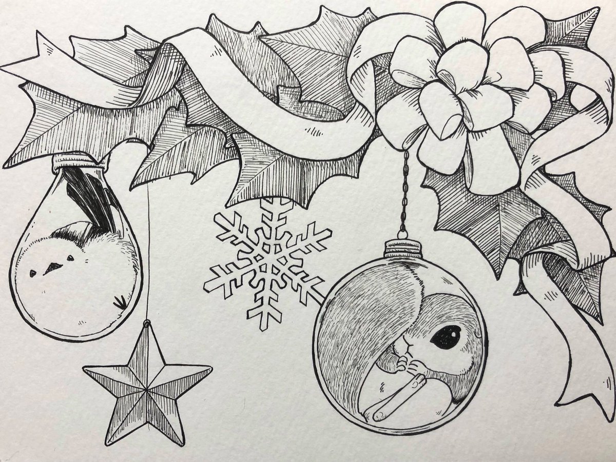 クリスマスオーナメントなエゾモモンガとシマエナガ #イラスト #ペン画