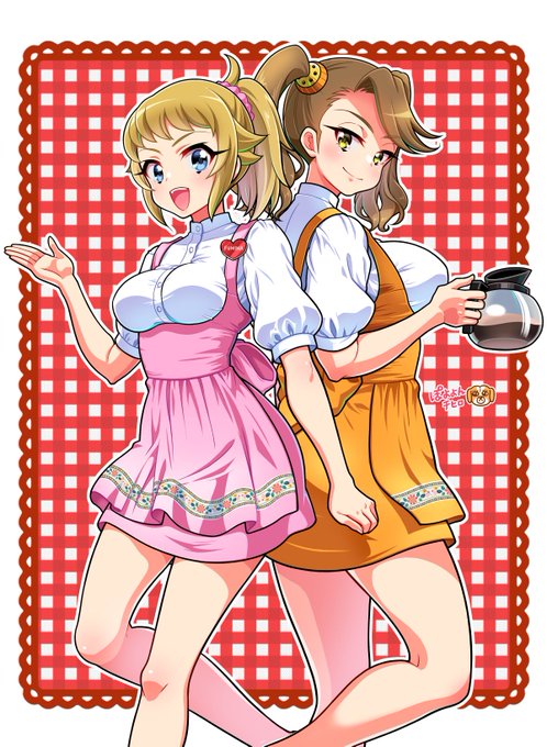 ビルドメタバースのキービジュアルにフミナパイセンの関係者がいるらしいのと今日はメイドの日らしいのでアンミラ衣装のフミナパイセンとギャン子再掲するわね🫖☕️ ウェイトレスはメイドではない気がするけど!