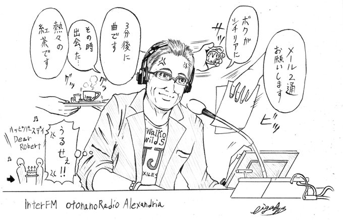 みなさん、こんにちは📻☔ 本日9月20日はロバート・ハリスさんのお誕生日✨🎁🎂🥃🎲✨ おめでとうございます㊗️🎊 これからも健康に気をつけて末永く番組続けて下さいね☺️ おめでたいのでイラスト描きました どうぞご査収ください✒️🙏 #alexjfn #ロバートハリス #イラスト