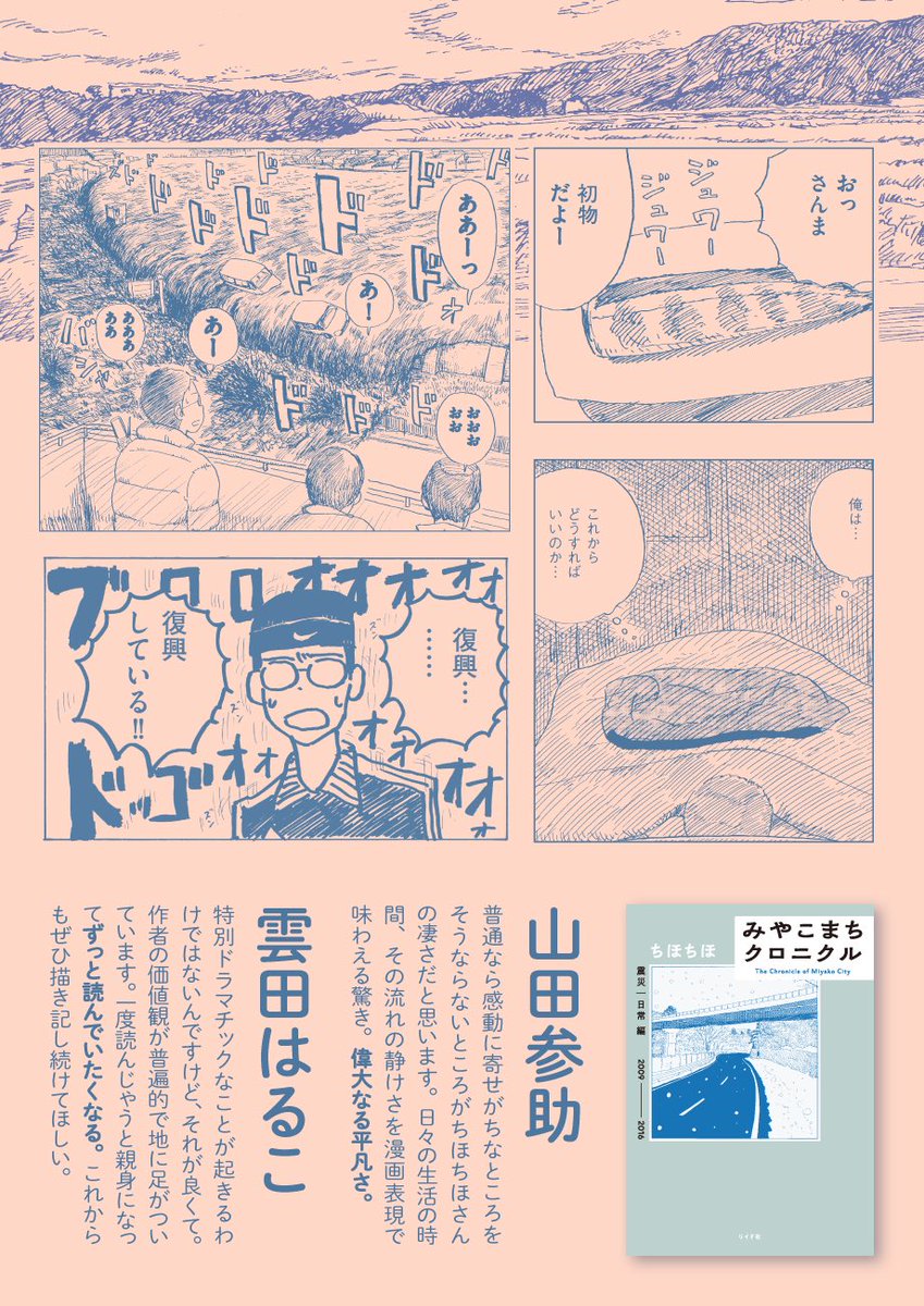 みやこまちクロニクル28話更新されてますto-ti.in/story/miyakoma…また、単行本の書影等も出ました。to-ti.in/story/miyakoma…「震災・日常編」の帯文を山田参助先生、雲田はるこ先生、「コロナ禍・介護編」の帯文・巻末解説を保坂和志先生に書いて頂きました。ぜひ読んでほしいです。