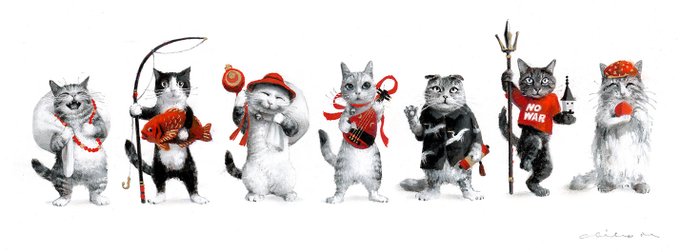 nowaki10周年「ことほぎ」展 「七福猫」を描きました。 笑門来福、商売繁盛、五穀豊穣、長寿延命、 諸病平癒、福徳厄除け、立身出世etc. まとめてどんとこい!の猫さまたち。 (ご売約済🙏感謝です) ご来店は完全予約制。 こちらから↓どうぞよろしくお願いします。 nowaki-kyoto.net