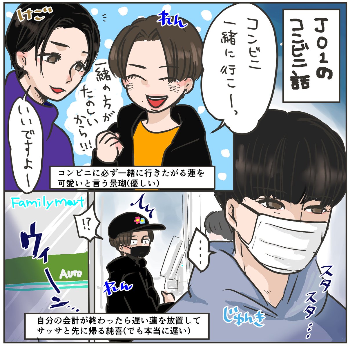 117 645 蓮くんがコンビニに一緒に行きたがるの可愛いって言う景瑚は優しいし、蓮くんがやたら買い物遅いのも可愛いし、一応一緒に行ってあげてるけど容赦無く置いて帰る純喜もわかる(わかる) #JO1fanart 21/12/04 12:34
