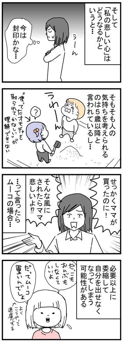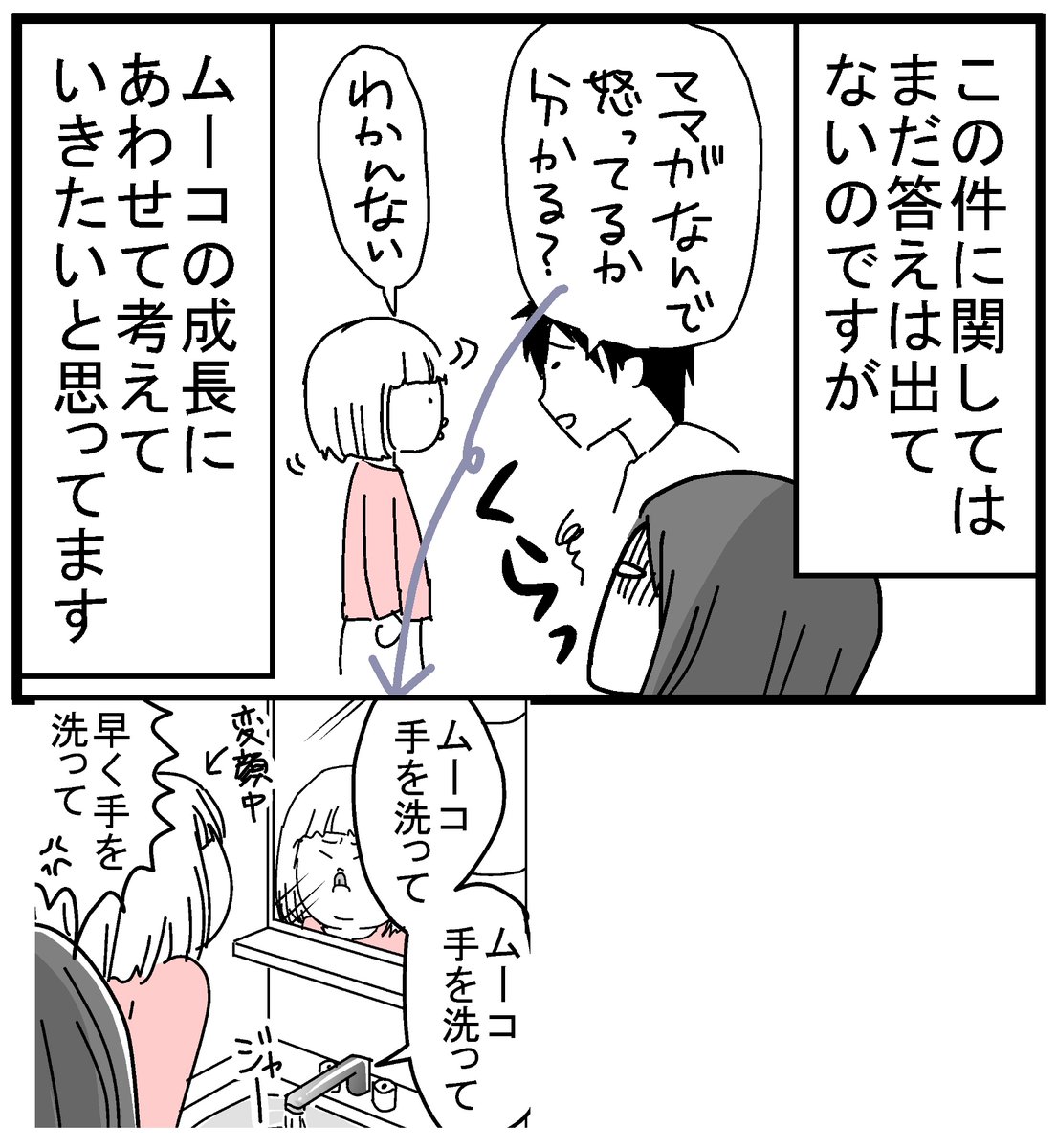 子どものしつけと自分の気持ちは分けるべきなのでは?と思った話 2/2 実は、当時は私以上に「自分の気持ちを分けて」上手くムーコに説明できていた夫が、最近はナナオのしつけで「パパがせっかく〇〇したのに」と感情で訴えるようになった。なぜそうなったかは分からない。今度話してみよう。
