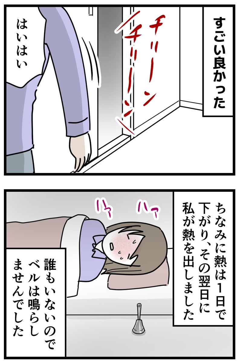 私も、呼び鈴鳴らしたら飛んできて看病してくれる人がほしい。 #育児漫画