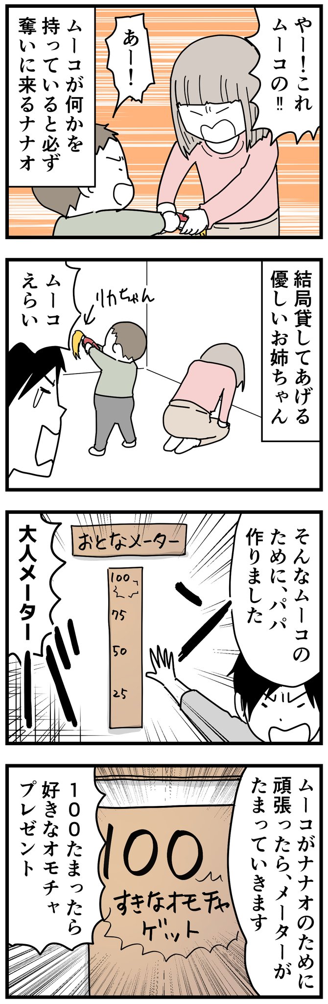 きょうだい喧嘩、上の子のための救済処置。 これ結局80までいったんだけど途中でムーコが飽きてしまいました。もっと早く100にたどりつくようにしてあげればよかったのかな。でもまだ諦めてないみたいで「はがさないで」と言われます。(そのわりに使ってない) #育児漫画