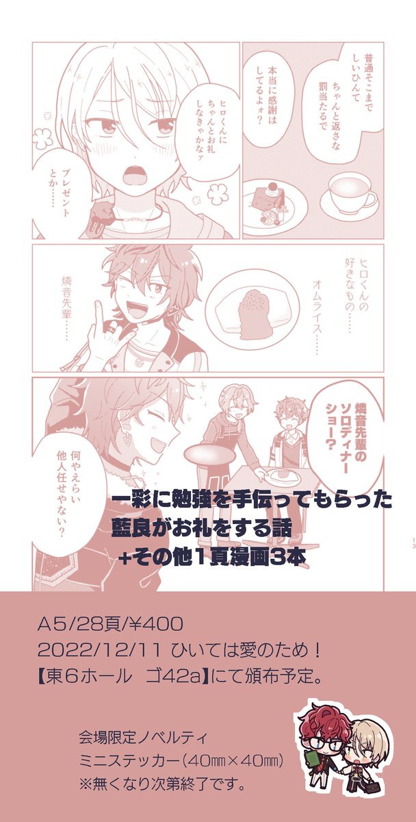 25 124 12/11ひいあい新刊サンプルです。A5/28頁/¥400【東6ホール ゴ42a/BBN】にて頒布予定です。よろしくお願いします。 pixiv⇒ pixiv.net/artworks/10342… 22/12/07 23:31