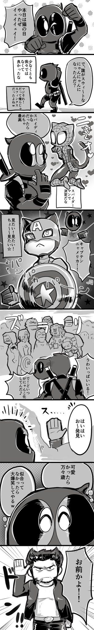 151 281 デッドプールで猫の日漫画描いたよ。割とMarveキャラがいっぱい出せて楽しかった。 #猫の日 #Deadpool #デッドプール 16/02/23 19:51