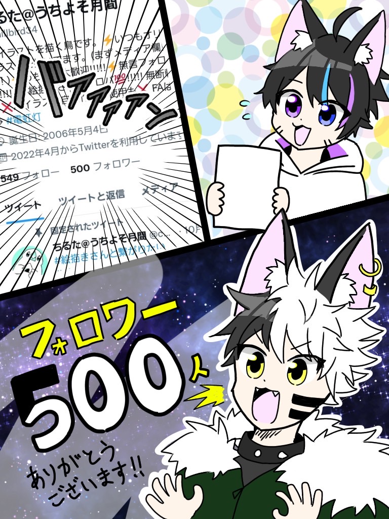 フォロワー500人ありがとうございます!!ここまで来るとは!!いつもイラストを見てくれてありがとうございます✨ネコ化計画準備中です!! #絵描きさんと繋がりたい #イラスト タローもびっくり