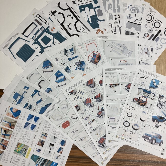 やっとこさ説明書も出来てきました!取説も10ページの大ボリュームに。 320パーツ、組み立て所要時間23時間。手のひらサイズのペーパーモデルです。 #ペーパークラフト #papermodel #ピックアップトラック #papercraft
