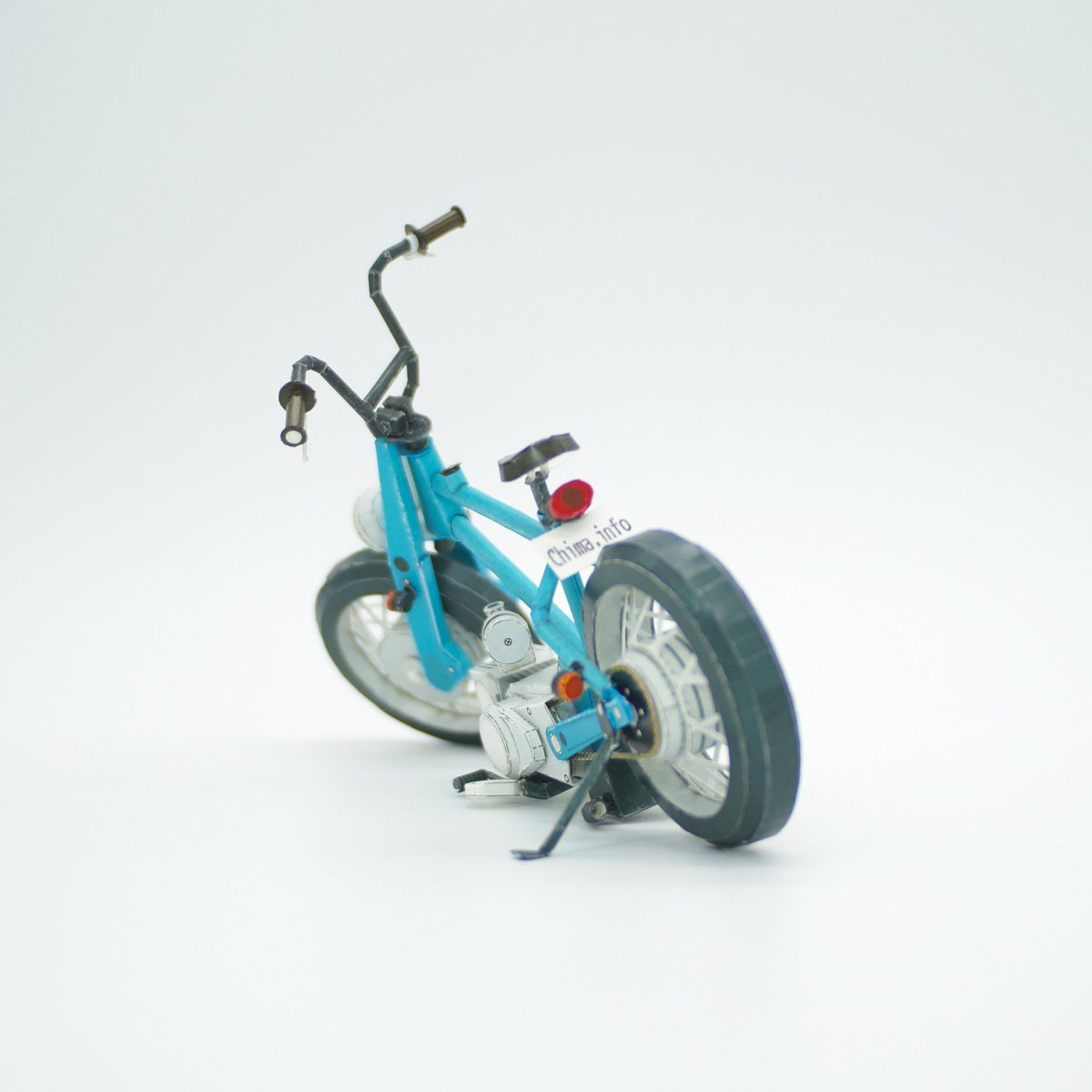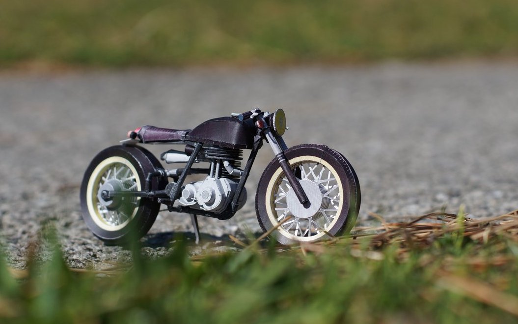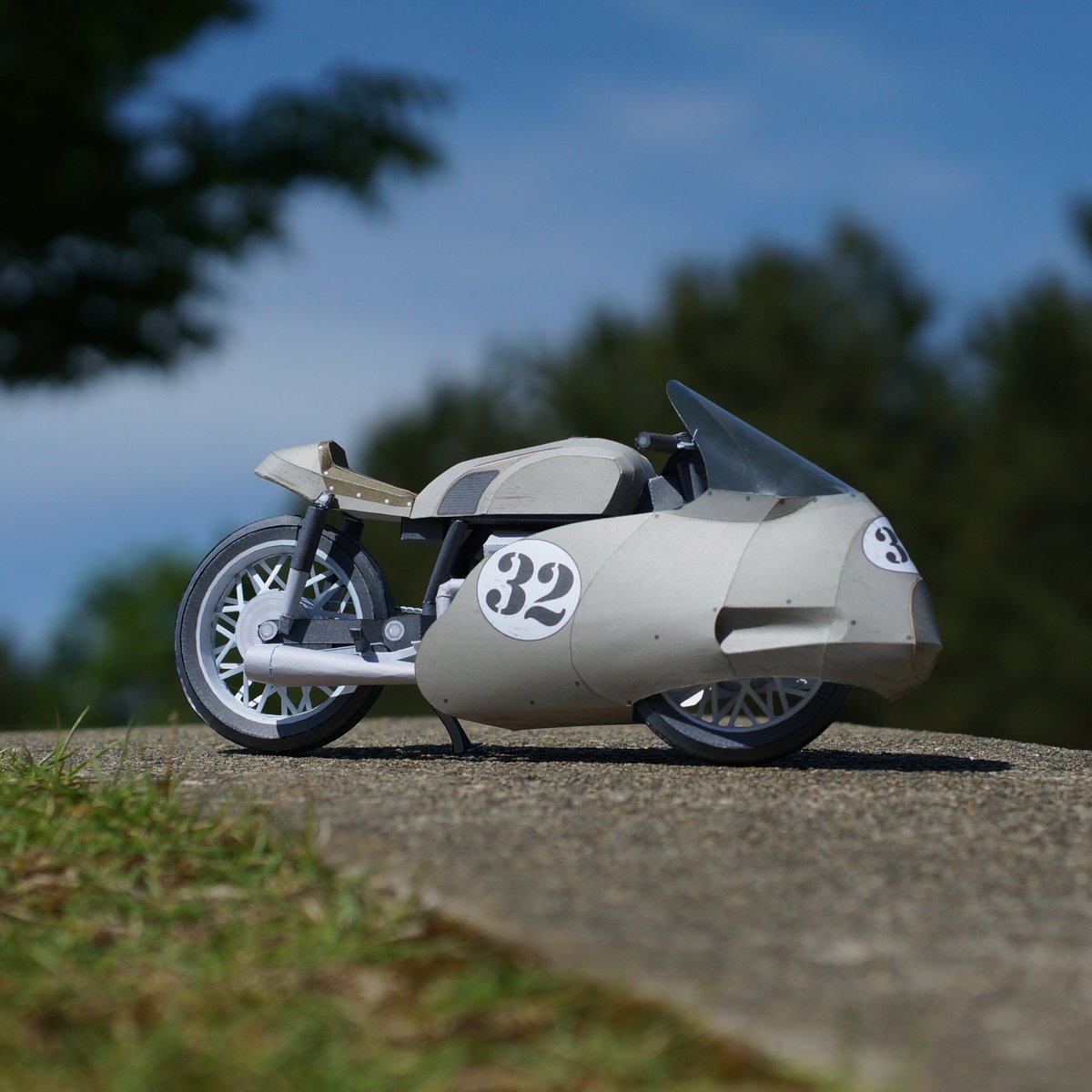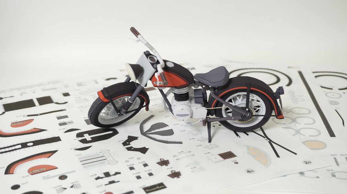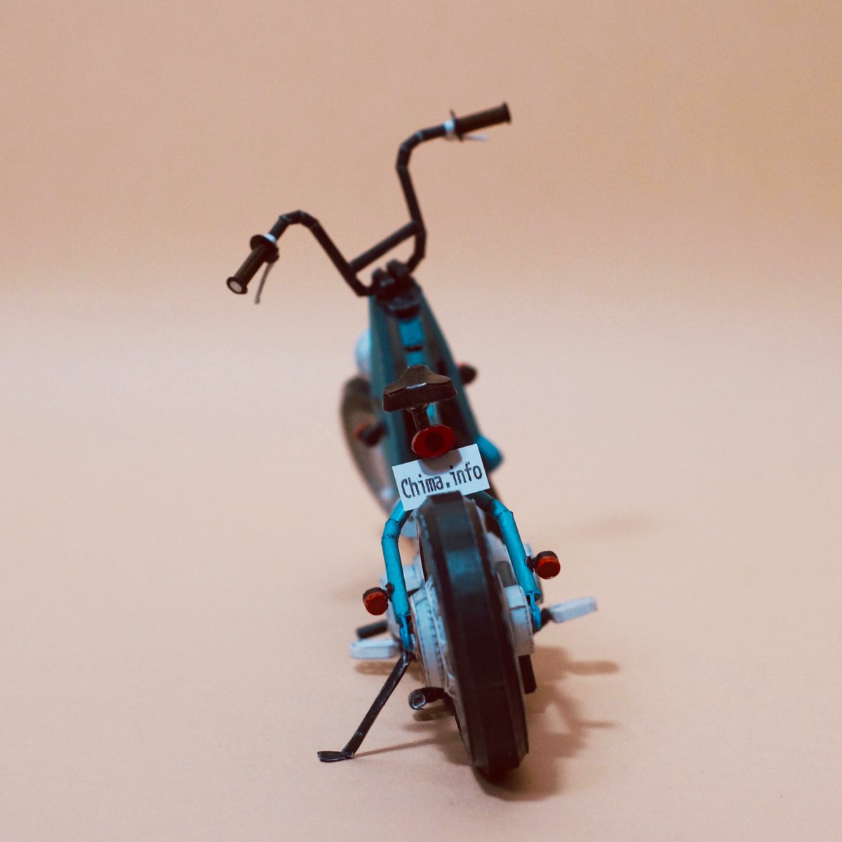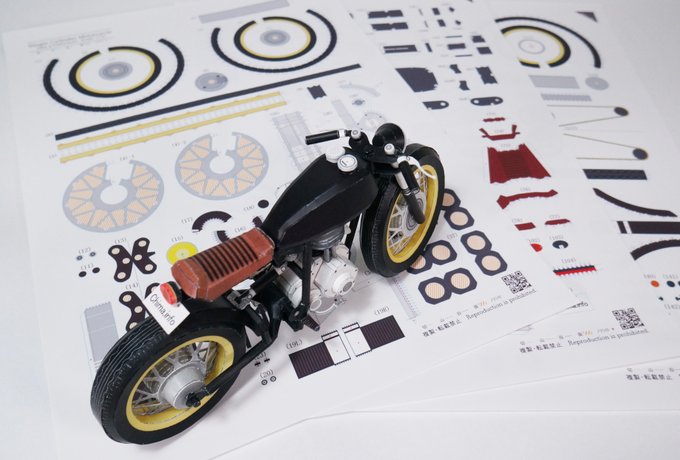 紙で作るモーターサイクル。 50㏄エンジンを自転車みたいなフレームにのっけて、ほんとの原動機付自転車なカスタムバイクをペパクラ化。完成サイズは160mmの手のひらサイズで、展開図を配布中。 #ペーパークラフト #紙バイク #展開図 #papercraft chima.info/category/fre_d…