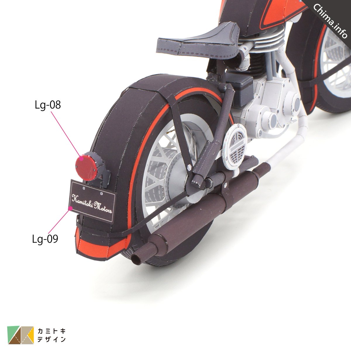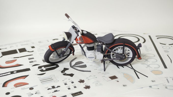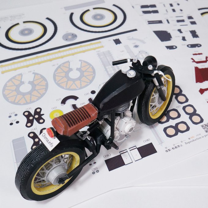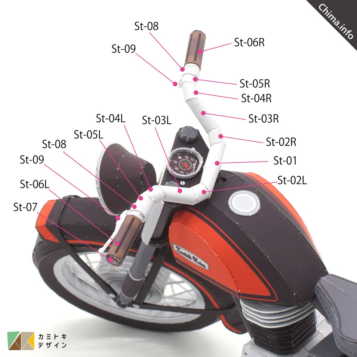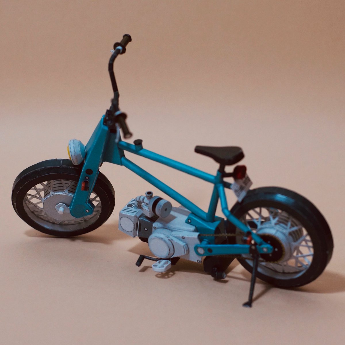 紙で作るモーターサイクル。 50㏄エンジンを自転車みたいなフレームにのっけて、ほんとの原動機付自転車なカスタムバイクをペパクラ化。完成サイズは160mmの手のひらサイズです。 #ペーパークラフト #紙バイク #展開図 #papercraft chima.info/category/fre_d…