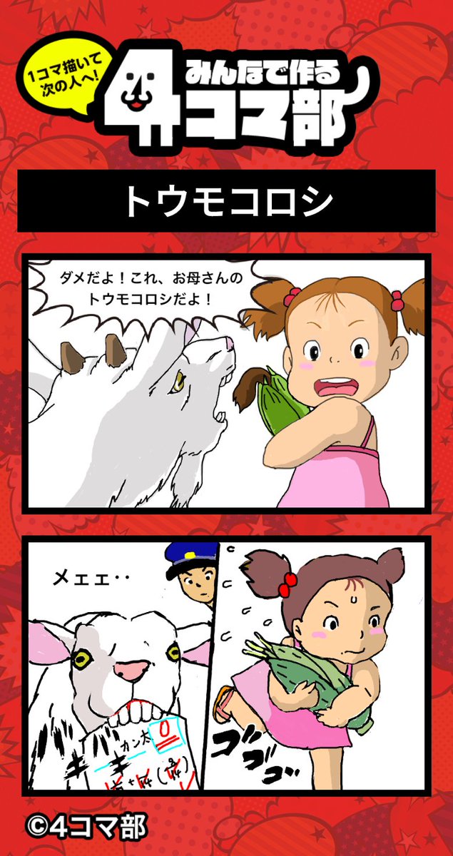 作品55【トウモコロシ】 4コマ部のアプリでこの漫画を見てみよう! 一コマ目が本当にきれいです!パグに苦しみながら、オチ描きました! link.4komabu.com/xNkCewSLGLeYQc… #4コマ部 #4コマ漫画 #漫画が読めるハッシュタグ #みんなで楽しむtwitter展覧会 #絵描きさんと繋がりたい #ジブリ