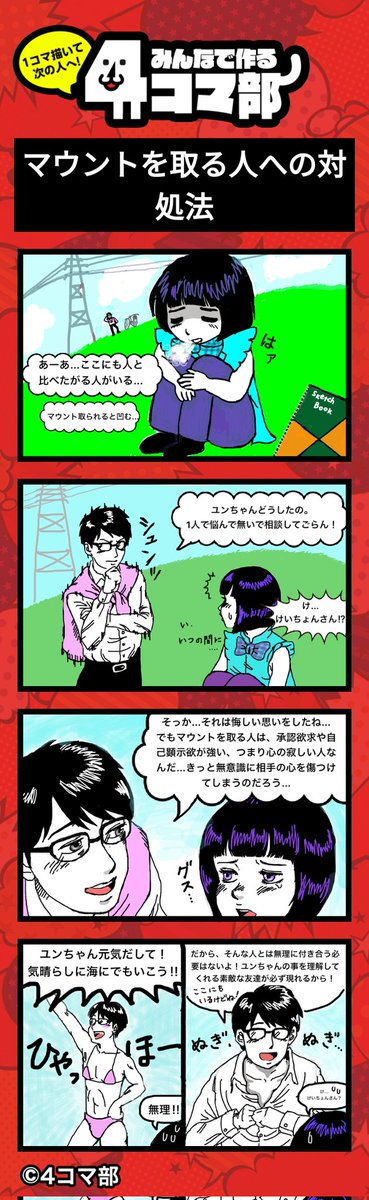 作品57【マウントを取る人への対処法】 小学生のゆんと、近所に住む年齢不詳のお兄さん、けいちょんさんのシリーズです! #4コマ部 #4コマ漫画 #漫画が読めるハッシュタグ #みんなで楽しむtwitter展覧会 #絵描きさんと繋がりたい 4コマ部のアプリで見てみよう! link.4komabu.com/qeAMQ8zDVSZH8e…