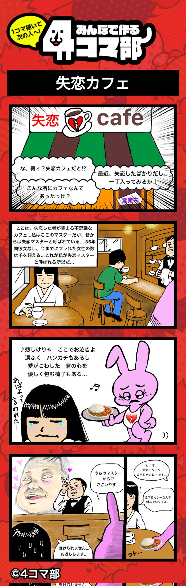 作品58【失恋カフェ♯1】 失恋した人以外にしか見えないカフェ? 4コマ部のアプリでこの漫画を見てみよう! link.4komabu.com/fTaDPqPnTEcFPV… #4コマ部 #4コマ漫画 #漫画が読めるハッシュタグ #みんなで楽しむtwitter展覧会 #絵描きさんと繋がりたい