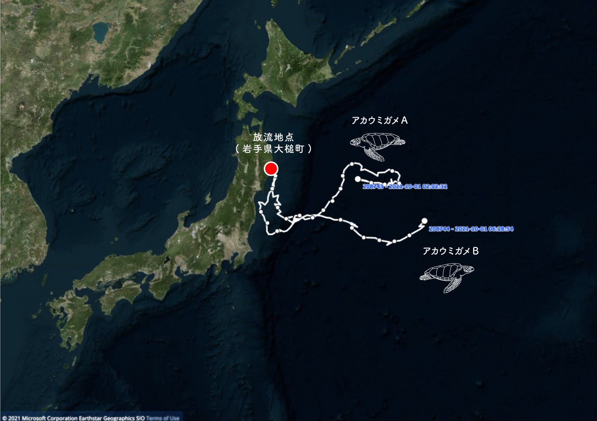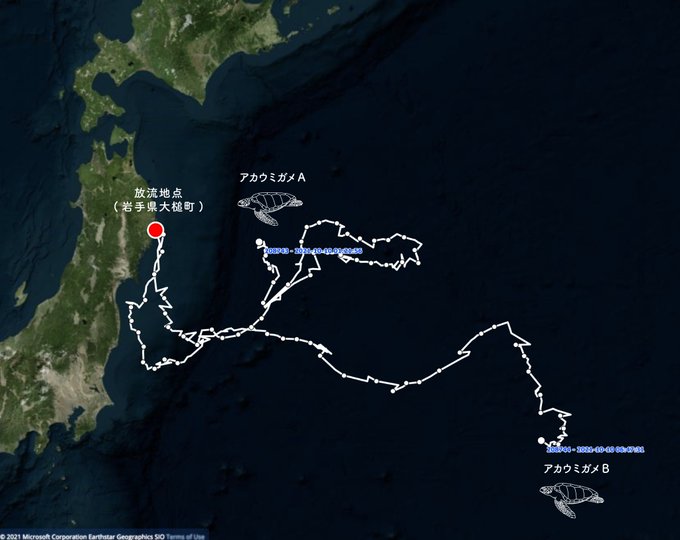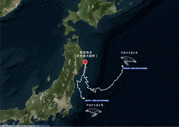 【追跡35日目】アカウミガメAは放流地点(大槌町)に近寄ってきました。沖へ向かっていたBは西側に方向転換しつつあります。 #かめ旅 twitter.com/chimomonga/sta…