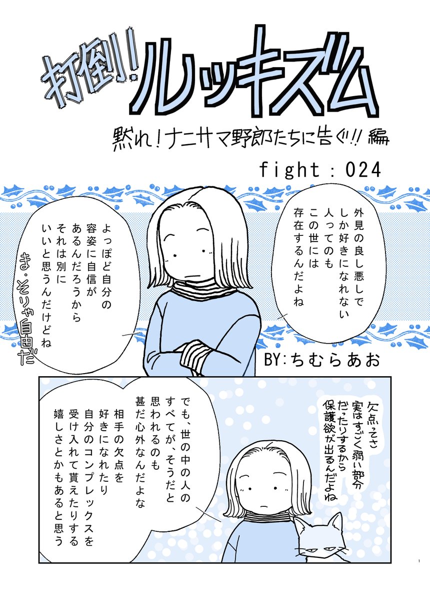 打倒!ルッキズム 黙れ!ナニサマ 野郎に 告ぐ!編 fight:016 クリスマスや正月に投下するのはどうかと思うので、早めの更新になりました…次回は30日更新です(;・∀・) #漫画が読めるハッシュタグ #マンガが読めるハッシュタグ #エッセイ漫画 #自己肯定感 #ルッキズム #外見至上主義 #いじめ