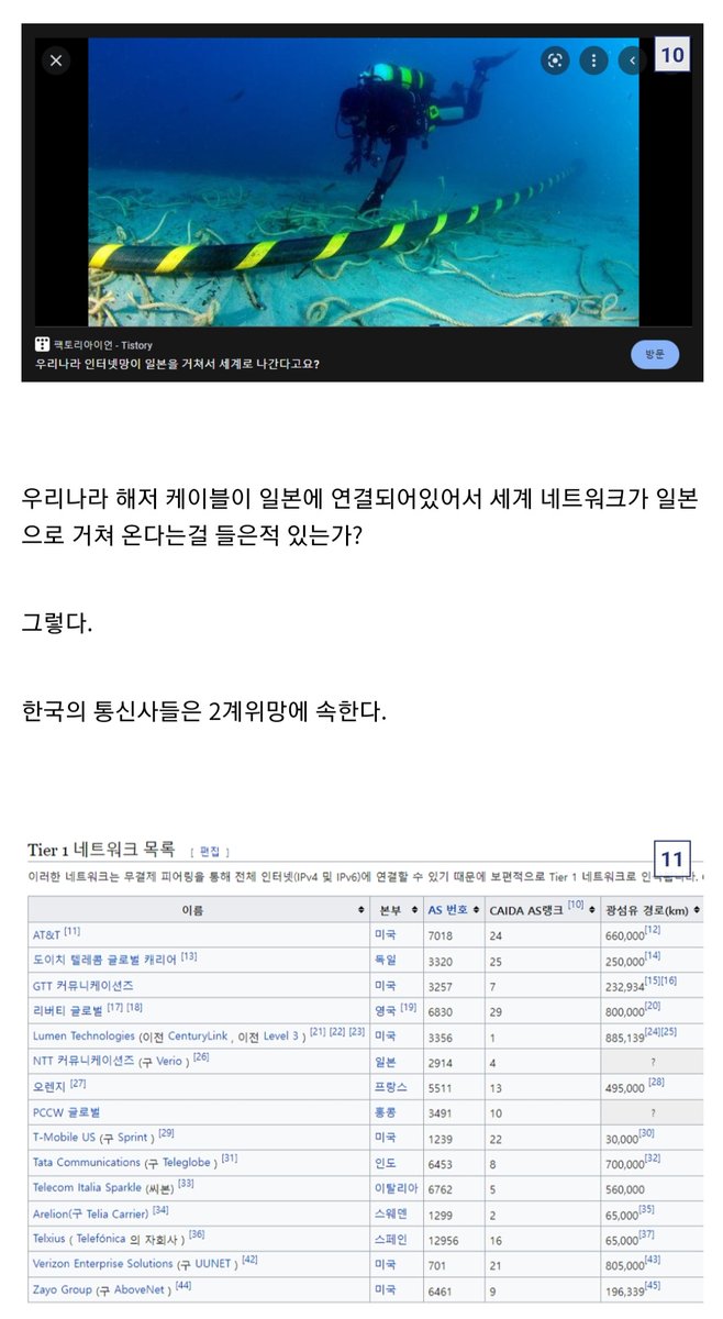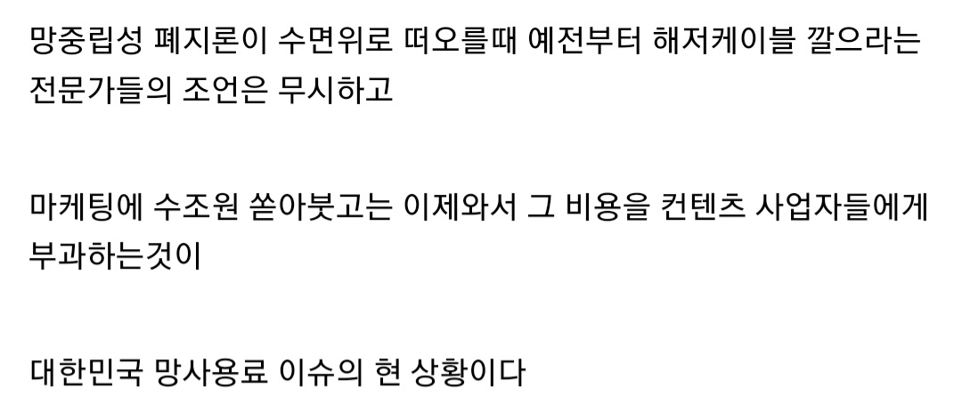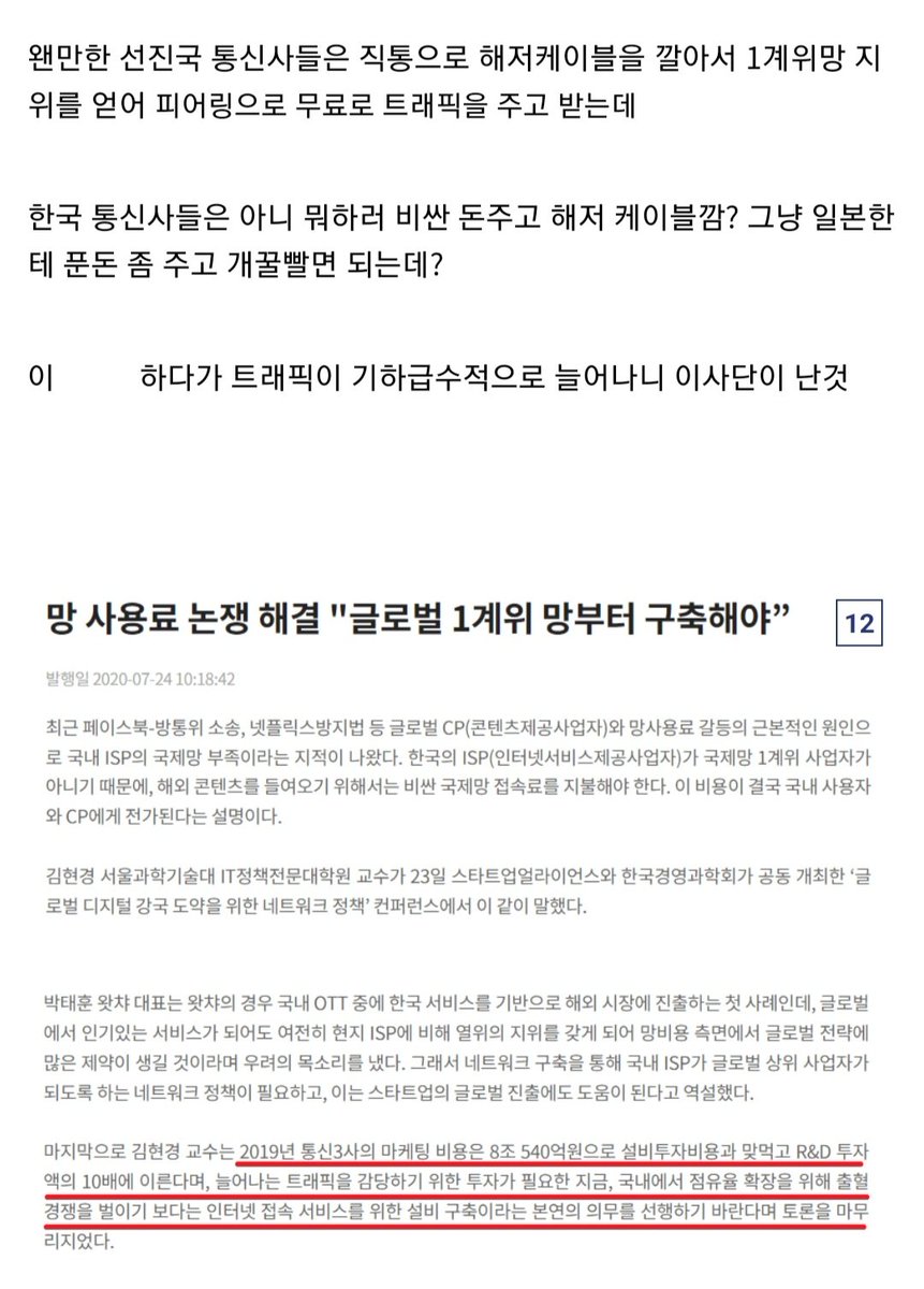 망 사용료가 국내 통신사를 보호하려는 법안이다라는 말이 나와서 캡쳐해 옴 요약하자면 망 사용료 법안은 국내 통신사들이 제때 해저 케이블 안 깔고 점유율 경쟁하다 발생한 손해를 애꿎은 사용자와 기업에게 돌리는 법안임