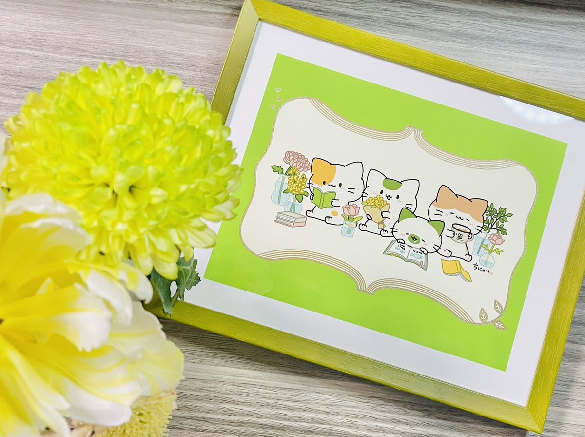 『#本とお花とまっちゃねこ』展まであと2日🌿 メインビジュアルを額縁にいれました。このイラストはデジタルで描きましたが、金色の縁どりはアナログでも加筆してキラキラさせています✨現地でぜひ眺めてみてください👀🌷 いよいよ明日が設営日です…!
