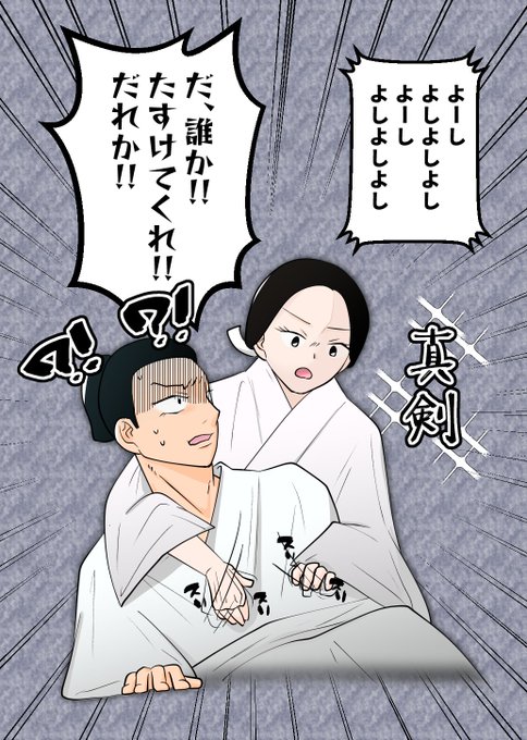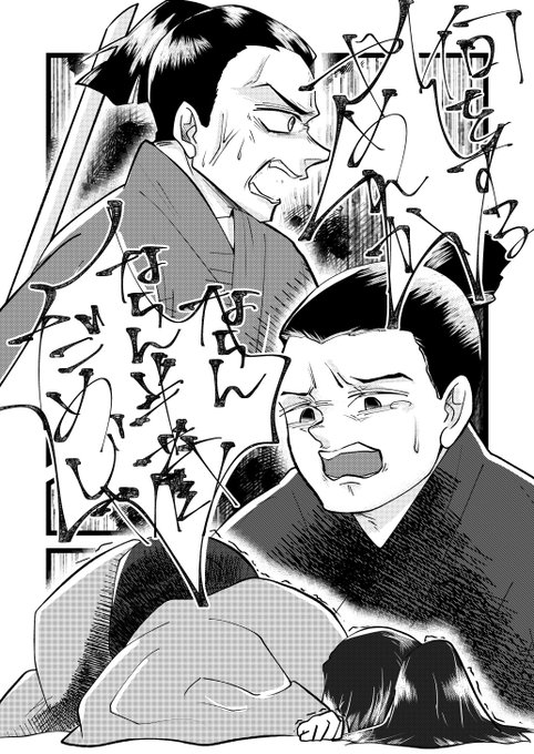 大鼠から刀を奪って子供のように後ろに隠す彦 大好きな若殿をさいごまで抱きしめる七 地面に頭をこすりつけて最大限の敬意を払う大鼠 覚悟ができている者と出来ていない者、つらい戦国の世が平和になりますように #どうする家康 #どうする絵
