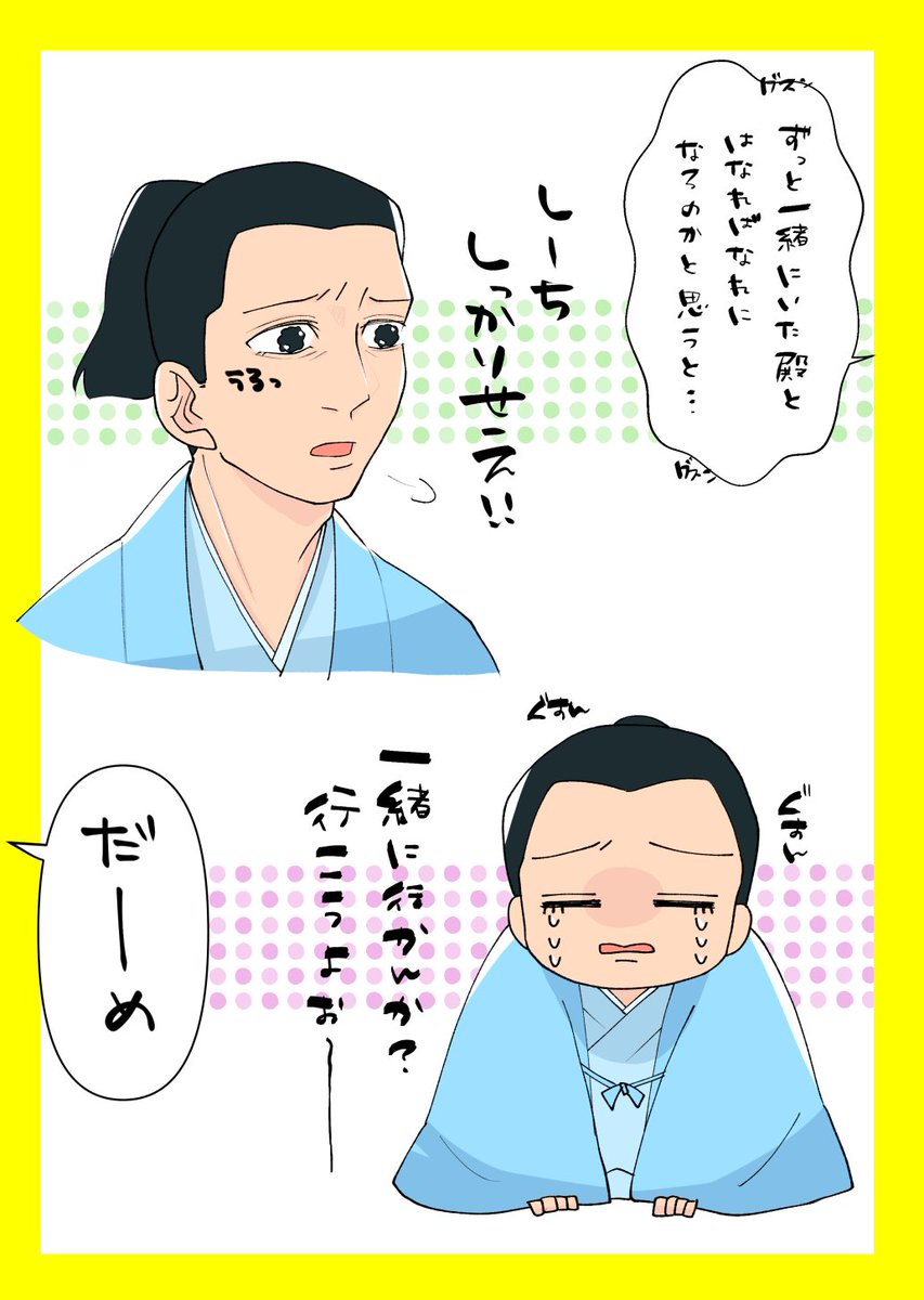 ぱち不機嫌そうにこっちみてるね~可愛いね~… 万千代くん?!その頭どうしたの?!?!?! #どうする家康 #どうする絵