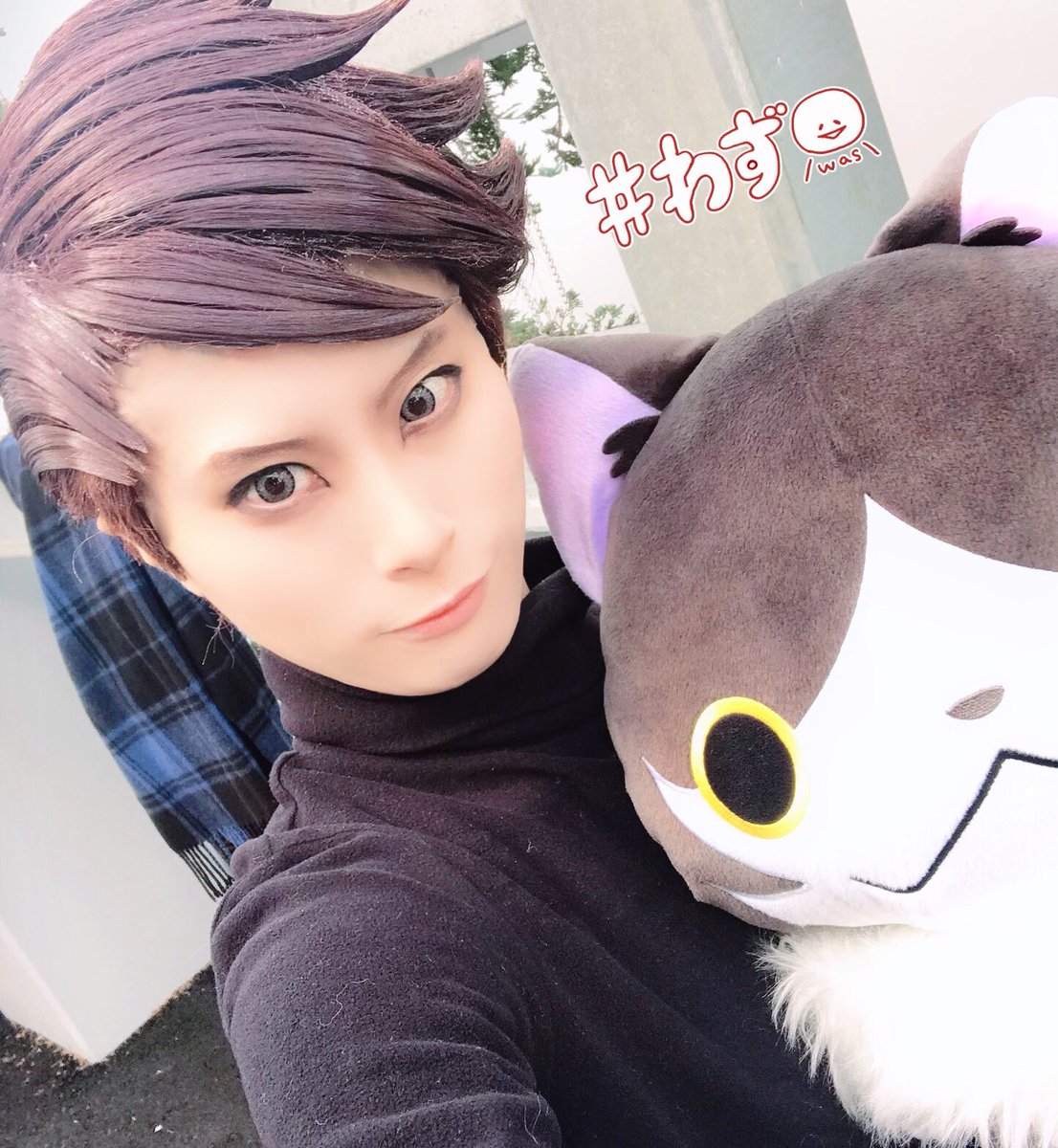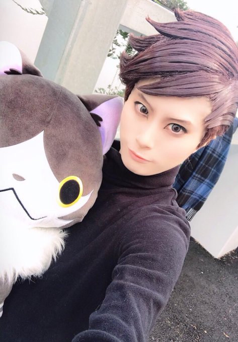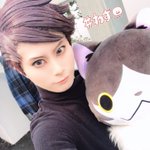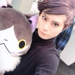 冬コミで、うっかり妖気汚染に引きずり込まれたと思ったらなぜだか分からないけどおそらく未来のひどく人の多い場所に飛ばされてしまったイツキ君やってます。猫又ちゃんと一緒です🙌🐈 #C97コスプレ