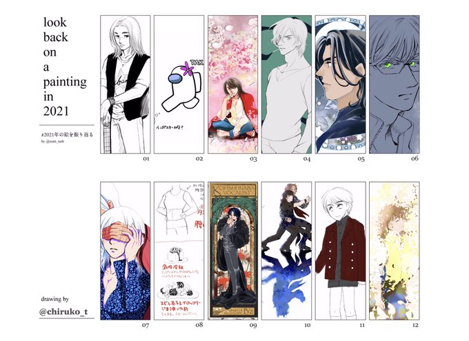 0 9 テンプレートだけお借りしてこの一年の絵まとめ。今年は去年より真面目にやってた。8月と11月は手薄。 9月にしこたま描いてたけど割愛されている。あとはレポらくがき。 21/12/16 00:44