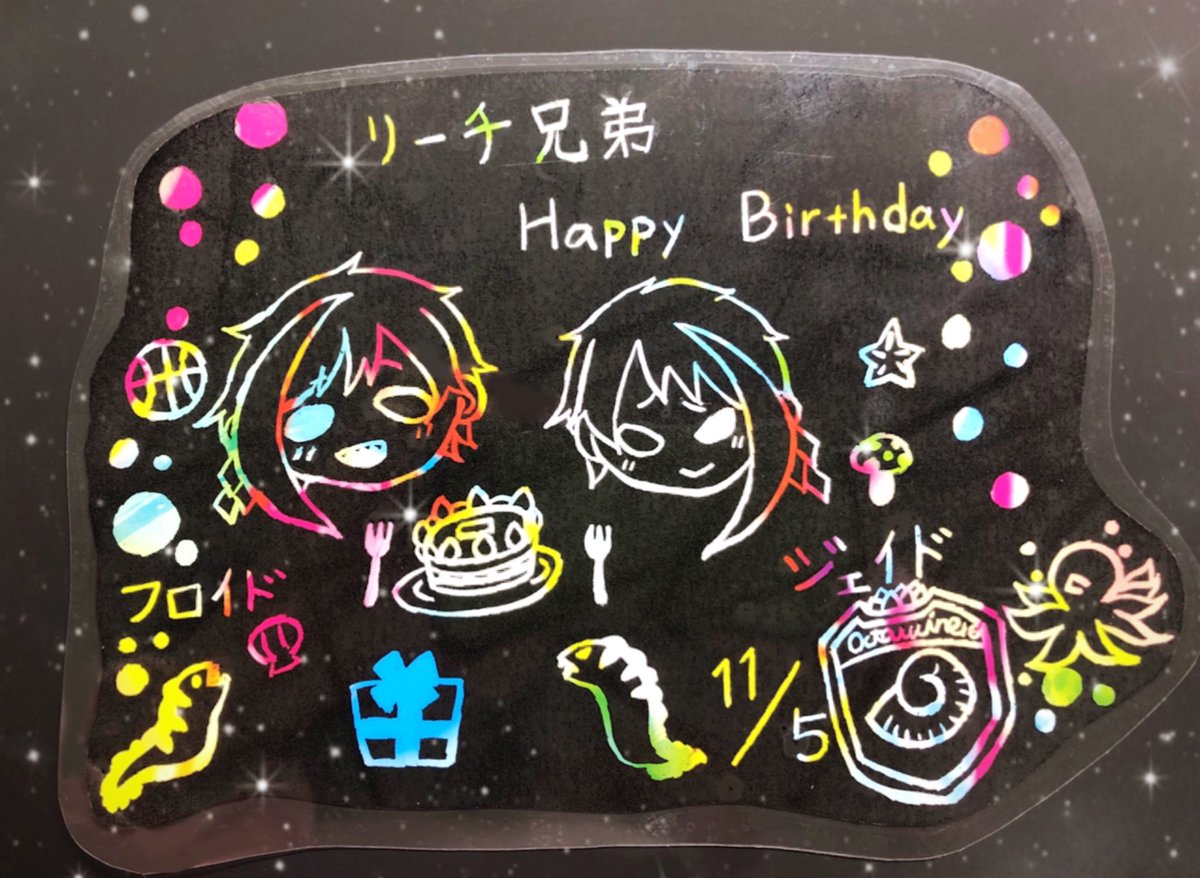 #リーチ兄弟誕生祭2020 #ジェイド・リーチ誕生祭2020 #フロイド・リーチ誕生祭2020 お誕生日おめでとう!! 削ったらカラフルな線が出てくる黒い紙に描きました。 この2人を最推ししてます。 #twstファンアート