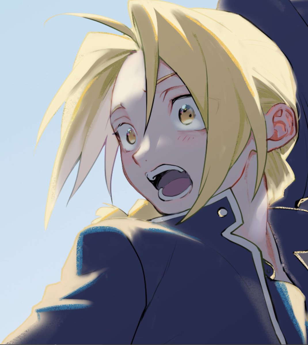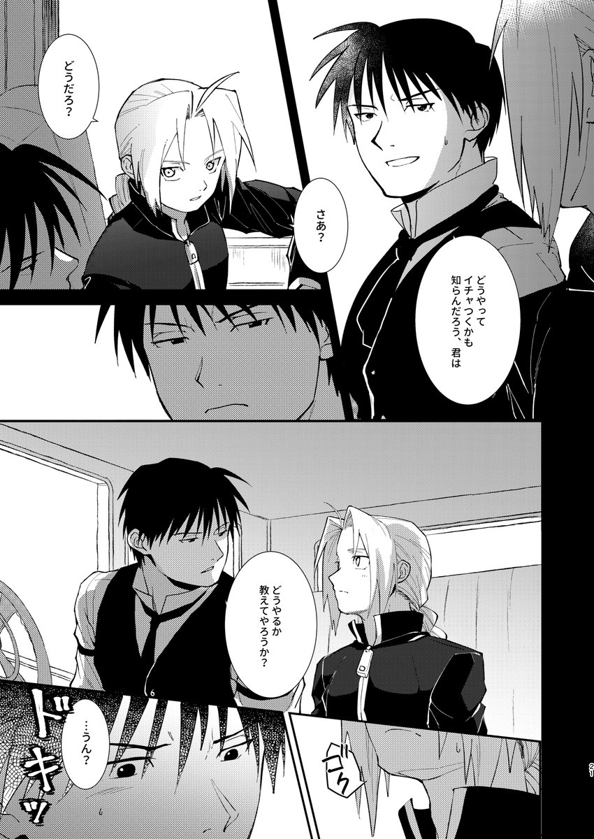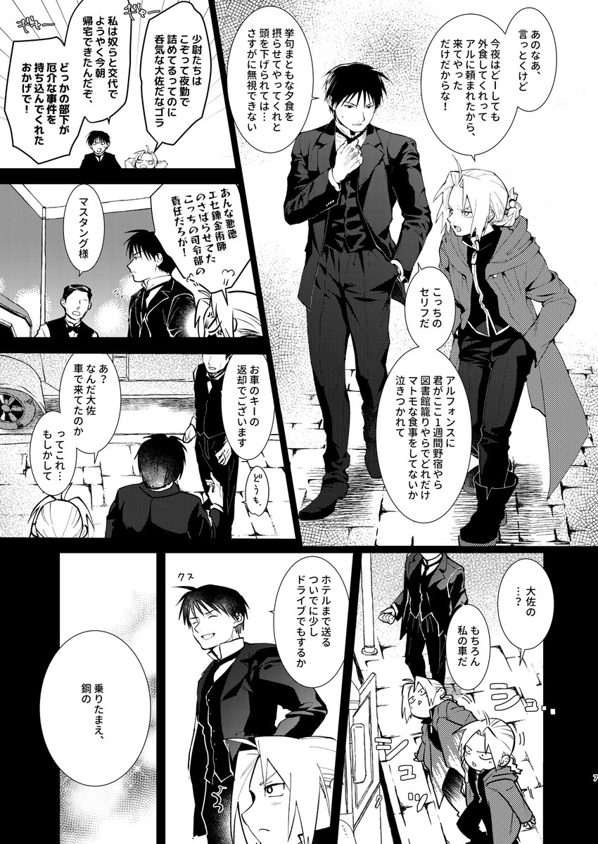 夏コミの新刊サンプルです。前に描いた520記念絵の続き漫画で、独身のマスタング新大総統のところに父になった兄さんが会いにくる話。当日のお品書き+サンプルはこちら→ pixiv.net/artworks/10040…